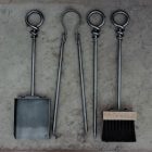 Features a stand, Poker, Tongs, folded and riveted dustpan, and brush.